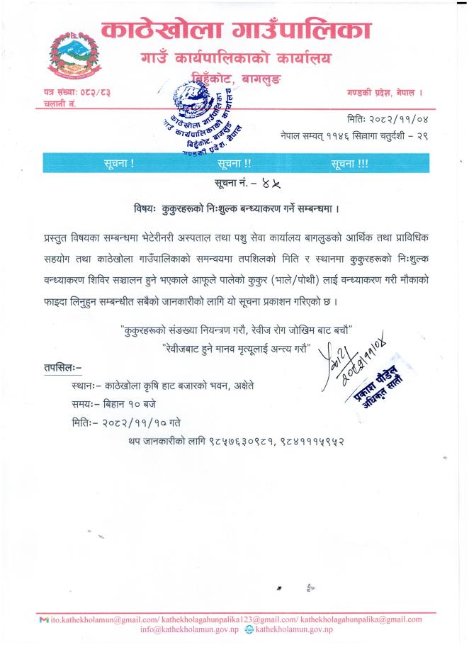 कुकुरहरूको निःशुल्क बन्ध्याकरण गर्ने सम्बन्धी सूचना ।